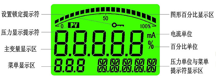 4.2按鍵功能說明 4.2.1功能鍵“M” ?測量模式下短按為開,進(jìn)入密碼設(shè)置。 ?測量模式下長按5秒為進(jìn)入主變量清零(即PV清零)。 ?設(shè)置模式下短按為使能參數(shù)修改,被修改參數(shù)閃爍,再次短按確認(rèn)參數(shù)修改,被修改參數(shù)停止閃爍。