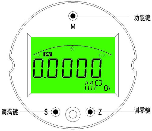 4.2.2調(diào)滿鍵“S” ?測量模式下短按為顯示模式修改功能。 ?測量模式下長按5秒為進(jìn)入調(diào)滿功能(即標(biāo)定變送器滿點(diǎn))。 ?設(shè)置模式下為設(shè)置參數(shù)加一功能,長按時(shí)連續(xù)移位加一。 4.2.3調(diào)零鍵“Z” ?測量模式下短按為顯示模式修改功能。 ?測量模式下長按5秒為進(jìn)入調(diào)零功能(即標(biāo)定變送器零點(diǎn))。 ?設(shè)置模式下為設(shè)置參數(shù)移位與減一功能,長按時(shí)連續(xù)移位或減一。 4.2.4按鍵功能綜述 儀表通過面板的三個(gè)按鍵實(shí)現(xiàn)所有的參數(shù)輸入和校準(zhǔn)數(shù)據(jù)的設(shè)置、采集,本儀表的設(shè)置和輸入采取了多種優(yōu)化措施來提高客戶的操作速度: ?儀表的移位鍵和增加鍵具有變速率功能。 ?儀表同時(shí)具有移位和增量輸入方法,針對需要大量數(shù)修改的菜單使用移位方式,需要連續(xù)輸入數(shù)據(jù)的菜單采取了增量方式。 ?儀表在設(shè)置狀態(tài)下會停止模擬輸出,所以如果60秒內(nèi)用戶沒有操作儀表,則會自動(dòng)退出到測量狀態(tài)。 ?儀表在正常退出菜單的時(shí)候才會保存所有設(shè)置的參數(shù)。 4.3快捷功能 ?儀表有主變量清零,零點(diǎn)有源遷移,滿點(diǎn)有源遷移三種快捷功能,便于用戶現(xiàn)場的快速設(shè)定。 4.3.1主變量清零 主變量清零即PV清零,是相對大氣壓下的零點(diǎn),不是傳感器量程的零點(diǎn)。將變送器直接置于大氣壓下,長按“M”鍵5秒以上,即可進(jìn)入主變量清零功能,如右圖,菜單區(qū)顯示“P=0”,通過“S”鍵和“Z”鍵選擇需要進(jìn)行的操作,提示符區(qū)相應(yīng)顯示:
