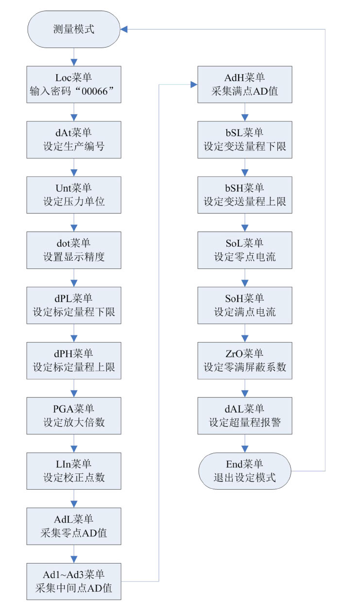 “NO” 不進(jìn)行滿點(diǎn)有源遷移; “YES” 進(jìn)行滿點(diǎn)有源遷移; 若30秒內(nèi)無任何按鍵操作,儀表將返回到測量模式。此功能禁止在生產(chǎn)過程中使用,適合在現(xiàn)場使用。 4.4設(shè)置框圖