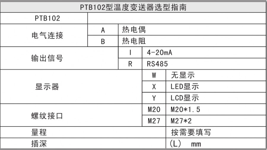 PTB102采用進(jìn)口溫度敏感元件,經(jīng)過專用集成電路處理,輸出4-20mA電流信號及RS485數(shù)字信號。產(chǎn)品具有精度高、穩(wěn)定性好、壽命長、可靠性高、安裝方便等特點(diǎn)。適用于石油、化工等行業(yè)進(jìn)行流體溫度的測量。