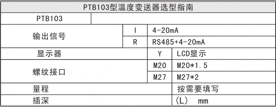 PTB103采用進口溫度敏感元件,經(jīng)過專用集成電路處理,輸出4-20mA電流信號及RS485數(shù)字信號。產(chǎn)品具有精度高、穩(wěn)定性好、壽命長、可靠性高、安裝方便等特點。適用于石油、化工等行業(yè)進行流體溫度的測量。